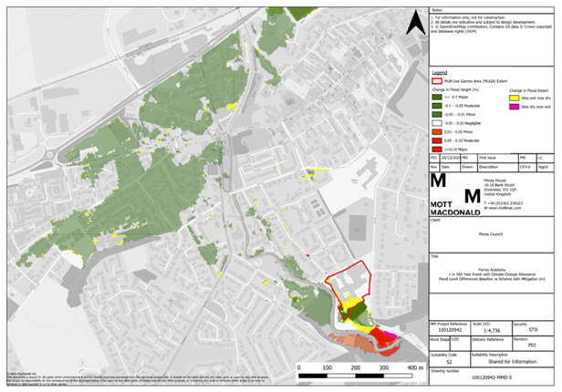 The area marked in red on the PAN document is highlighting where the 3G pitch and car park will be placed once the existing school is demolished. The development of the area to the south of the current school is included within the project and an area of ground lowering is being provided to the south of the site. This will fill with water in the event of extreme rainfall therefore reducing the risk of any flooding downstream.