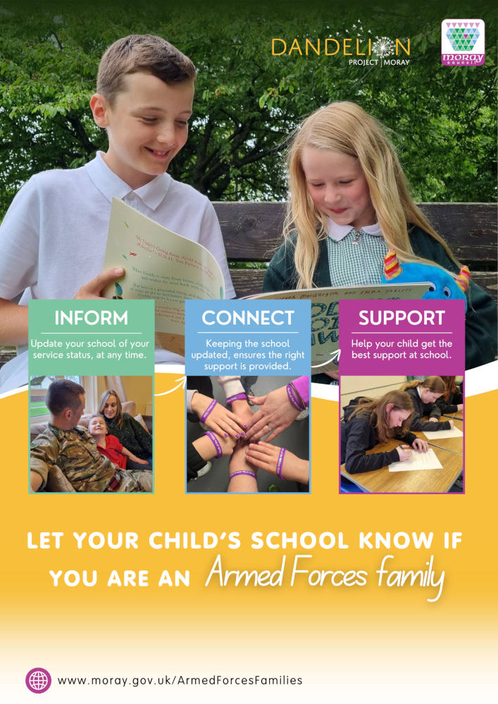 In Moray, the Dandelion Project is actively collaborating with schools to enhance support for military children. To ensure children receive the necessary assistance, families are encouraged to inform their child's school of their Armed Forces status.